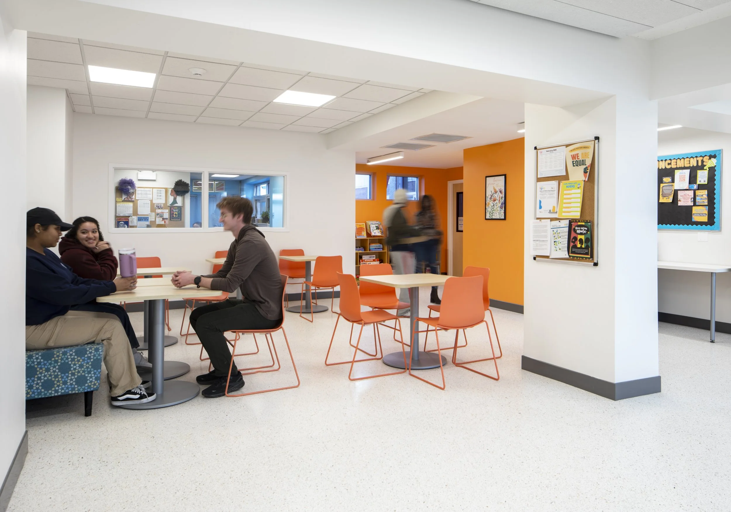 Remodeled and upgraded restrooms feature fully enclosed stalls, wheelchair access, and gender inclusivity. Open visibility to communal areas around the sinks enable program supervisors to ensure restrooms are safe spaces.